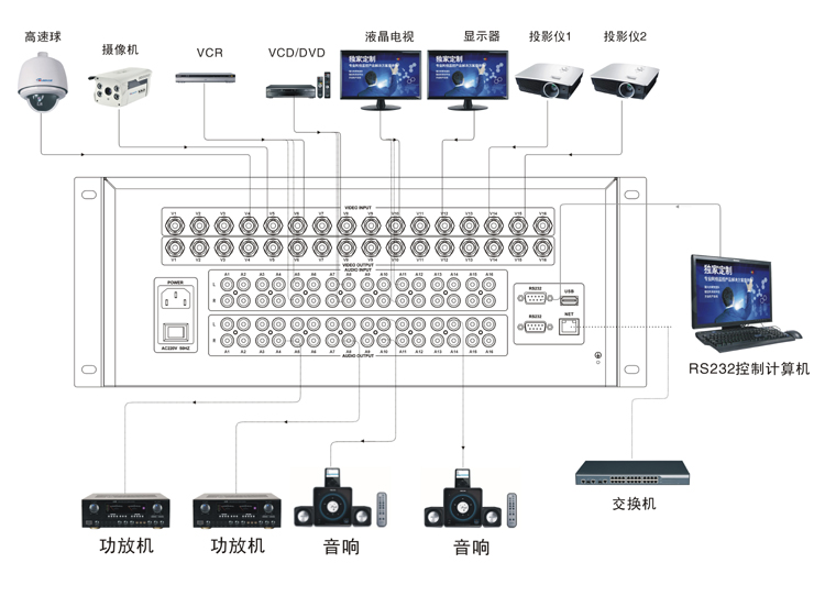 LH60-AV1608 | 16進8出視音頻矩陣切換器,視頻RCA接口,音頻非平衡立體聲RCA接口。面板/紅外/RS-232控制。 |