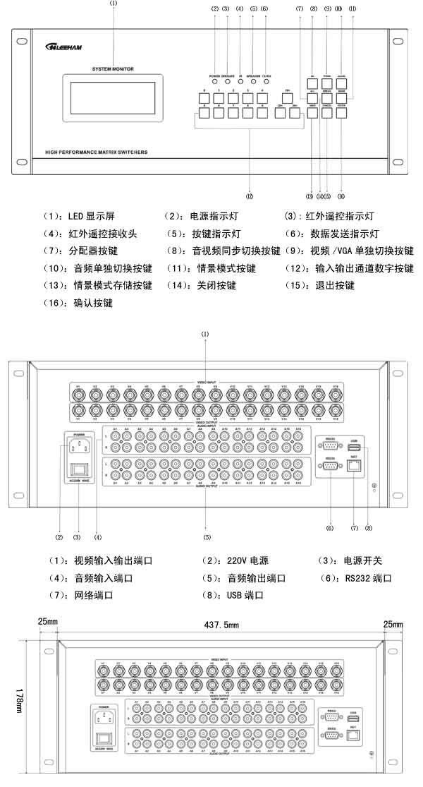 LH60-AV1616 | 16進16出視音頻矩陣切換器,視頻BNC接口,音頻非平衡立體聲RCA接口。面板/紅外/RS-232控制。 |