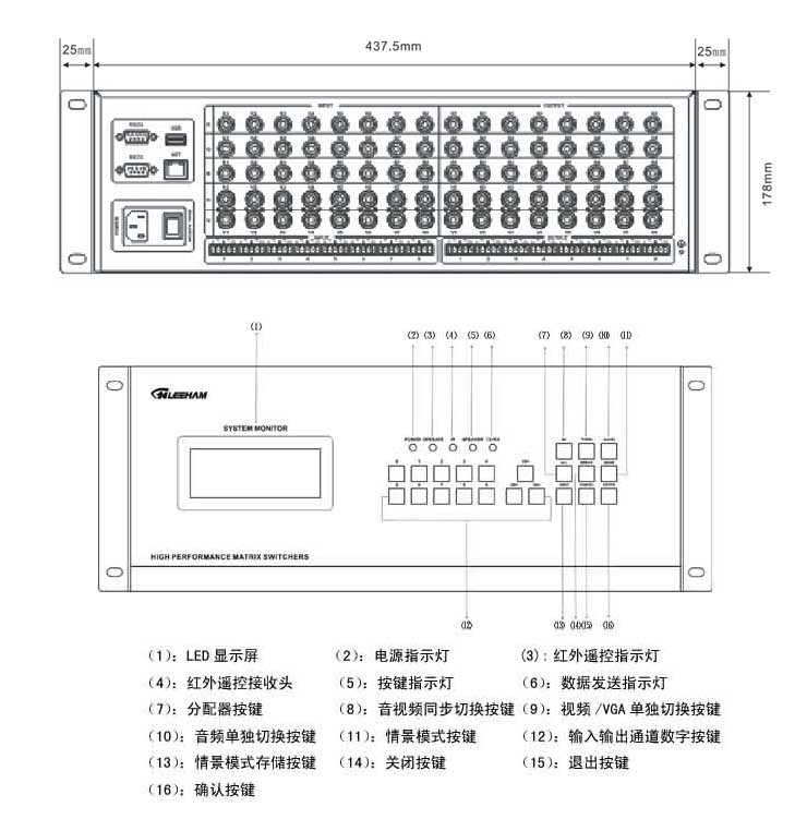 8進8出RGB矩陣,5BNC接口,750MHZ,面板/紅外/RS-232控制。 音頻非平衡立體聲,RCA接口。 |
